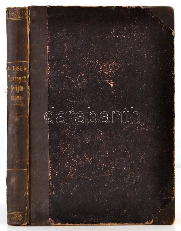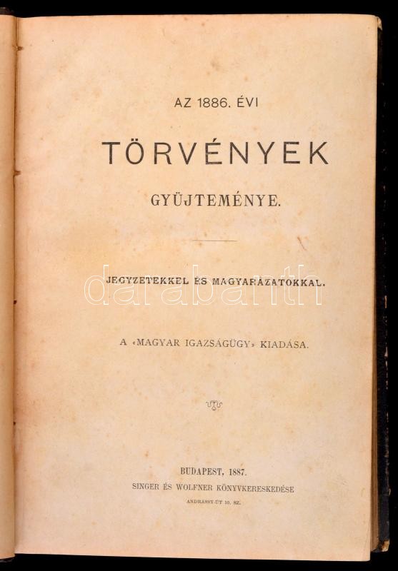 Az 1886. évi törvények gyűjteménye. Jegyzetekkel és magyarázatokkal. A Magyar Igazságügy kiadása. Bp.,1887, Singer és Wolfner, 373+2 p. Korabeli félvászon-kötés, kopottas borítóval, sérült gerinccel, 211-220 oldalak között a lapok hiányosak, a 221/222 oldal hiányzik, a tartalomjegyzéknél a lapok foltosak.
