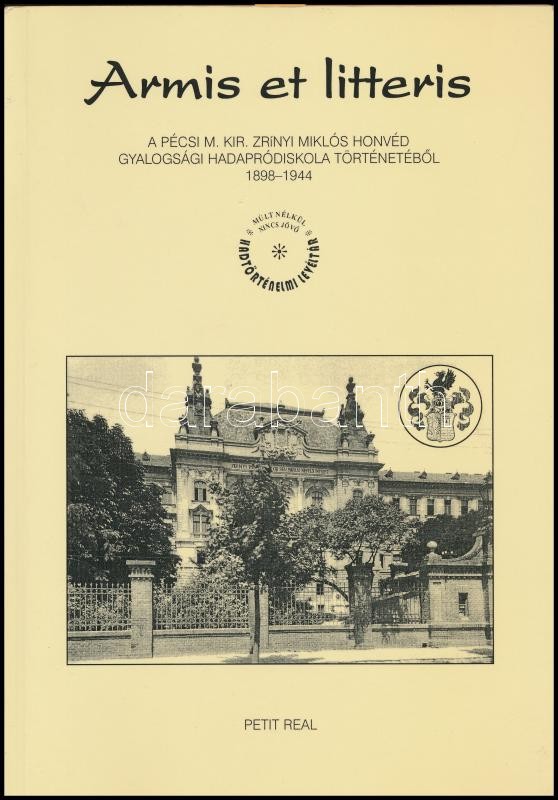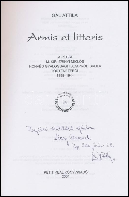 Gál Attila: Armis et litteris. A pécsi m. kir. Zrinyi Miklós Honvéd Gyalogsági Hadapródiskola történetéből. 1898-1944. Hadtörténelmi Levéltári Kiadványok. Bp., 2001, Petit Real. Fekete-fehér fotókkal illusztrált. Kiadói papírkötés. A szerző által dedikált.