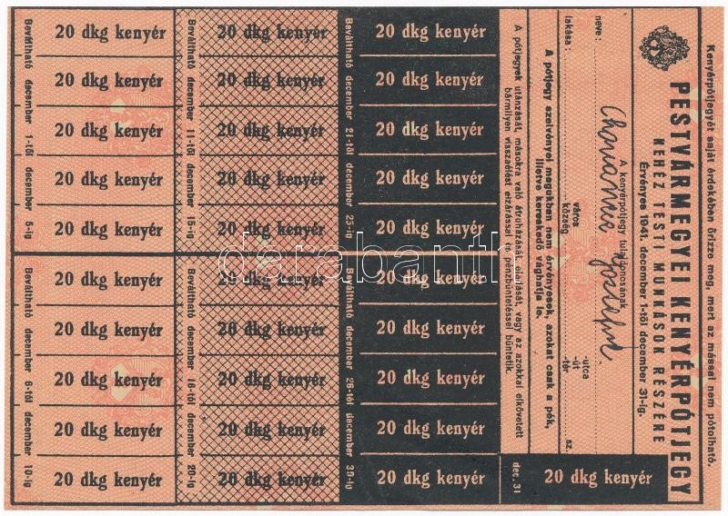 ~1940. "Pestvármegyei kenyérpótjegy nehéz testi munkások részére&... https://www.darabanth.com/de/322-Fernauktion/322.0/Numismatik/Notgeld-aus-Papier-und-Metall~2500006/7E1940-Pestvarmegyei-kenyerpotjegy-nehez-testi-munkasok-reszere-TI-~II1785016