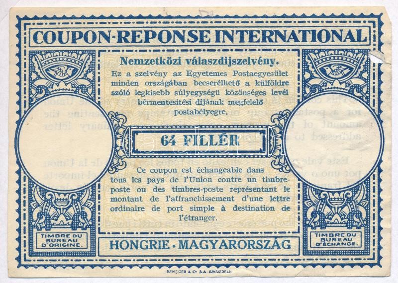 Hungary ND 64 Fillér "International Reply Coupon" without stamp C:F hole
