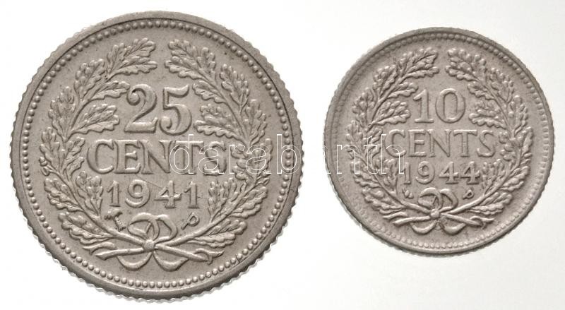 Netherlands 1941. 25 Cents Ag + 1944. 10 Cents Ag "Wilhelmina I" C:AU
