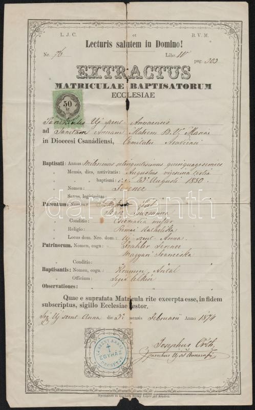 1874 Újszentanna (Sântana), latin nyelvű keresztelési anyakönyvi kivon... https://www.darabanth.com/de/323-Fernauktion/323.0/Andere-Sammelgebiete/Dokument~500016/1874-Ujszentanna-SC3A2ntana-latin-nyelvu-keresztelesi-anyakonyvi-kivonat-serult-okmanybel~II1775533