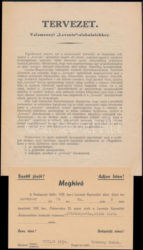 1925, 1931 Levente mozgalommal kapcsolatos iratok, tervezet, igazolván... https://www.darabanth.com/de/323-Fernauktion/323.0/Andere-Sammelgebiete/Dokument~500016/1925-1931-Levente-mozgalommal-kapcsolatos-iratok-tervezet-igazolvany-meghivo-4-db~II1795323