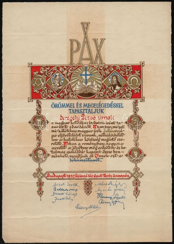 1937 Katolikus írók oklevele Nagyemőkei Seregély Dezső (1867-1948) ezredes, szobrászművésznek a magyar katolikus irodalom iránt tanúsított odaadásáért, Nyisztor Zoltán (1893-1979) író, Mécs Lajos (1895-1978) költő, Rónay György (1913-1978) költő, író, Just Béla (1906-1954) író, Aradi Zsolt (1908-1963) író, szerkesztő, és Kállay Miklós (1887-1967) politikus, korábbi földművelésügyi miniszter, későbbi miniszterelnök (1942-1944) és mások aláírásaival.