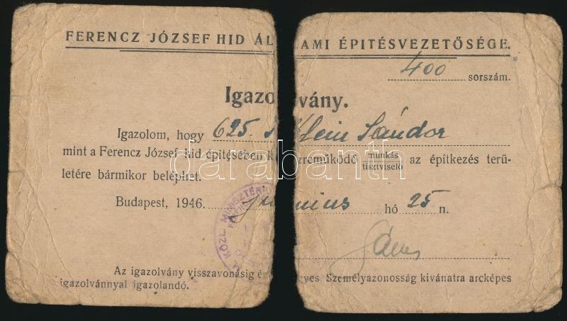 1946 Bp., Ferenc József híd állami építésvezetősége által kiállított i... https://www.darabanth.com/de/323-Fernauktion/323.0/Andere-Sammelgebiete/Dokument~500016/1946-Bp-Ferenc-Jozsef-hid-allami-epitesvezetosege-altal-kiallitott-igazolvany-kettes~II1790020