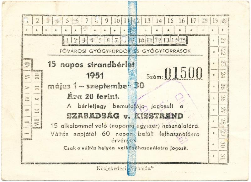 Beschreibung: 1951 15 napos fürdőbérlet a Szabadság strand vagy a Kisstrand használatára