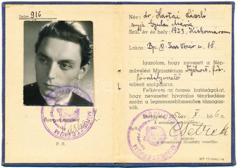 1952 a Népművelési Minisztérium fényképes igazolványa Hartai László (1... https://www.darabanth.com/de/323-Fernauktion/323.0/Andere-Sammelgebiete/Dokument~500016/1952-a-Nepmuvelesi-Miniszterium-fenykepes-igazolvanya-Hartai-Laszlo-1925-1987-foosztaly~II1790678