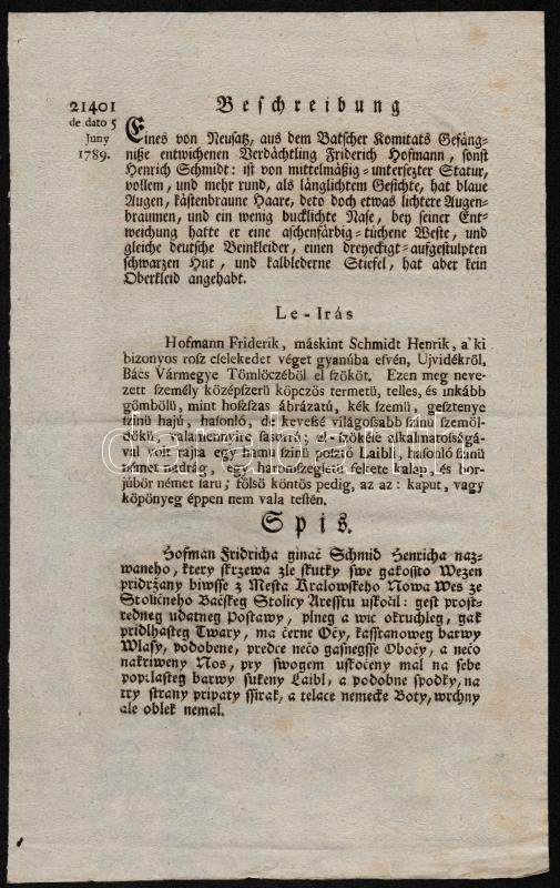 1789 Szökött fegyenc körözvénye https://www.darabanth.com/de/323-Fernauktion/323.0/Andere-Sammelgebiete/Drucksachen~500028/1789-Szokott-fegyenc-korozvenye~II1789923