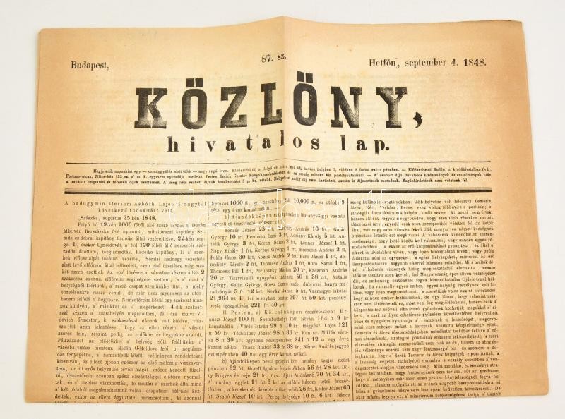 1848. szeptember 4. Közlöny, hivatalos lap, benne a szabadságharc híre... https://www.darabanth.com/de/323-Fernauktion/323.0/Andere-Sammelgebiete/Drucksachen~500028/1848-szeptember-4-Kozlony-hivatalos-lap-benne-a-szabadsagharc-hireivel~II1795548