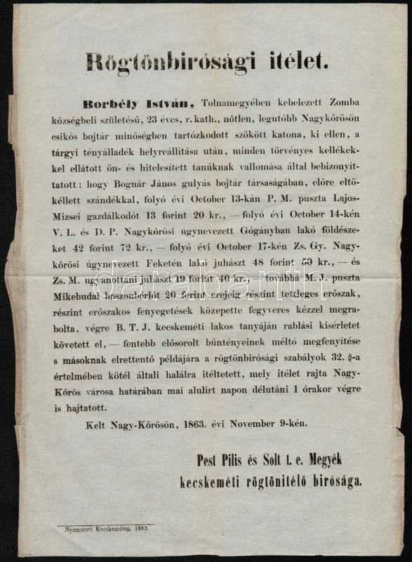 1863 Nagykőrös rögtönbírósági ítélet rabló ügyében https://www.darabanth.com/de/323-Fernauktion/323.0/Andere-Sammelgebiete/Drucksachen~500028/1863-Nagykoros-rogtonbirosagi-itelet-rablo-ugyeben~II1789911