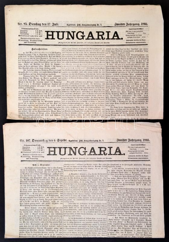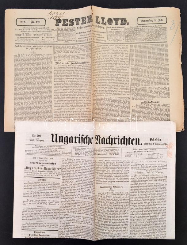 1864-1879 3 db német nyelvű pesti folyóirat, Ungarische Nachrichten nr. 199 1864. szeptember 1.,Hungaria nr. 85. 1866. július 17., Pester Lloyd nr. 182. 1879. július 3.,