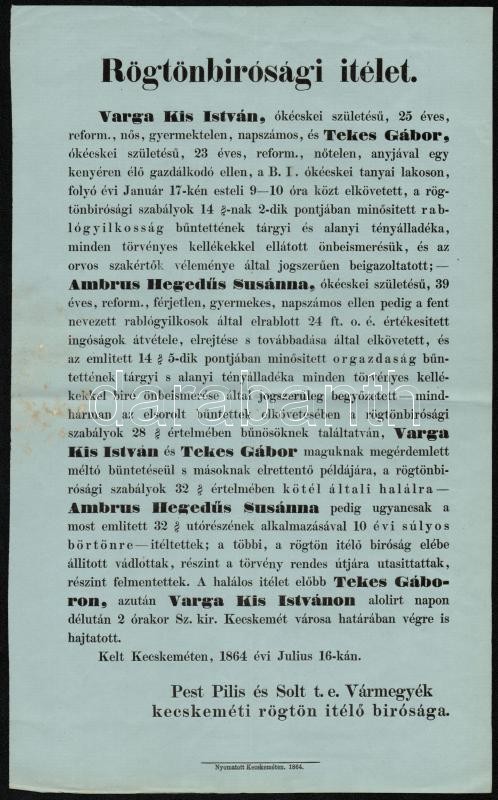 1864 Rögtönbírósági (statárium) ítéletek rablógyilkossági ügyekben https://www.darabanth.com/de/323-Fernauktion/323.0/Andere-Sammelgebiete/Drucksachen~500028/1864-Rogtonbirosagi-statarium-iteletek-rablogyilkossagi-ugyekben~II1789934