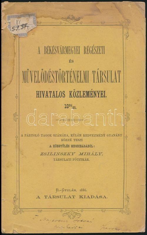 1886 Békésgyula, A Békésvármegyei Régézeti és Művelődéstörténeti Társu... https://www.darabanth.com/de/323-Fernauktion/323.0/Andere-Sammelgebiete/Drucksachen~500028/1886-Bekesgyula-A-Bekesvarmegyei-Regezeti-es-Muvelodestorteneti-Tarsulat-hivatalos-kC3~II1795375