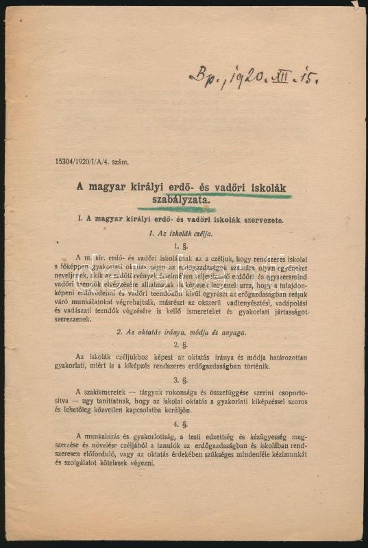 1920 Bp., A magyar királyi erdő- és vadőri iskolák szabályzata, 11p https://www.darabanth.com/de/323-Fernauktion/323.0/Andere-Sammelgebiete/Drucksachen~500028/1920-Bp-A-magyar-kiralyi-erdo-es-vadori-iskolak-szabalyzata-11p~II1790106