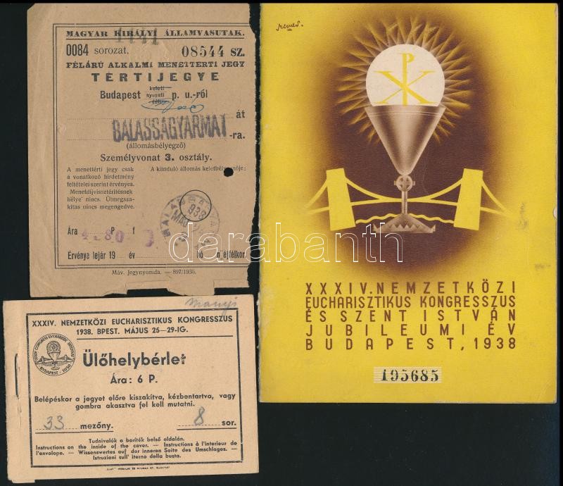 1938 XXXIV. Nemzetközi Eucharisztikus Kongresszus és Szent István Jubileumi Év igazolványfüzet. Budapest, 1938, Pallas Nyomda. Kiadói tűzött papírkötés, reklámokkal, 1. sz. tőszelvény használt, Balassagyarmat bélyegzővel.+Benne félárú MÁV jeggyel, valamint a XXXIV. Nemzetközi Eucharisztikus Kongresszus ülőhelybérletével