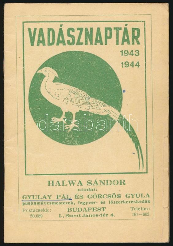 1943/1944 Bp. I., Halwa Sándor utódai vadásznaptár https://www.darabanth.com/de/323-Fernauktion/323.0/Andere-Sammelgebiete/Drucksachen~500028/19431944-Bp-I-Halwa-Sandor-utodai-vadasznaptar~II1790096