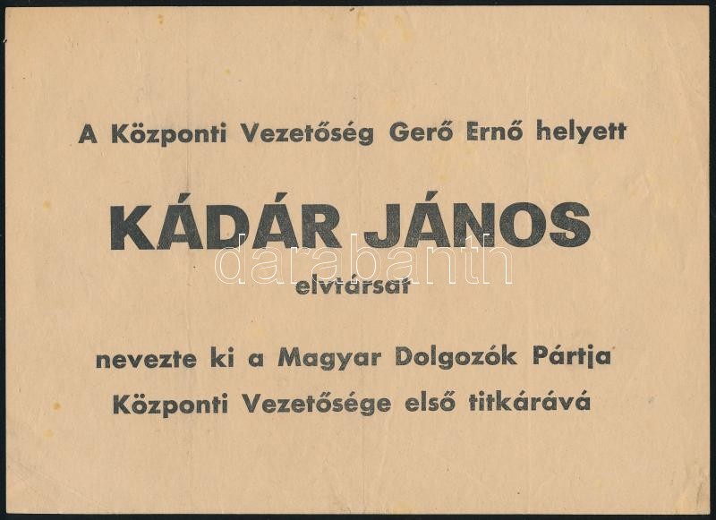 1956 "A Központi Vezetőség Gerő Ernő helyett Kádár János elvtársat nevezte ki a Magyar Dolgozók Pártja Központi Vezetősége első titkárává", röplap, hajtásnyommal