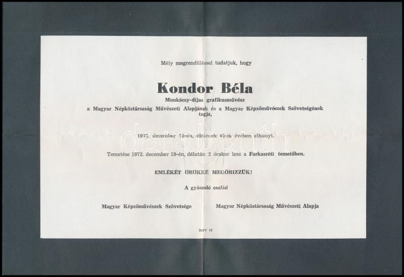 Beschreibung: 1972 Kondor Béla (1931-1972) Munkácsy-díjas grafikusművész, festőművész halálozási értesítője