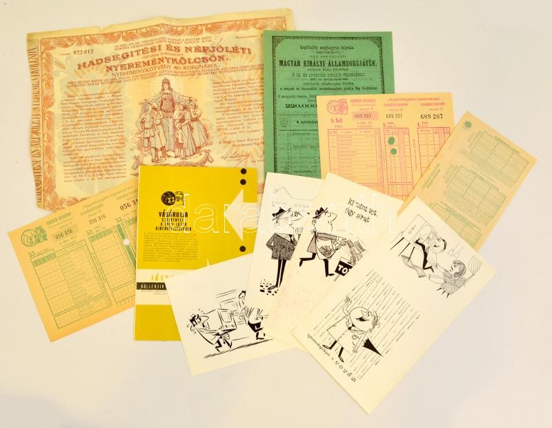 cca 1879-1960 Vegyes nyomtatvány tétel, 10 db, közte totó-lottó szelvények és prospektus, karikatúrák, Magyar Királyi Államsorsjáték reklám nyomtatványa 1879-ből, a hadsegítési és népjóléti nyereménykölcsön sorsolási terve, utóbbi kissé viseltes állapotban, a többi jó állapotban.