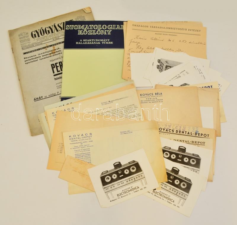 cca 1930-1940 Vegyes orvosi papír tétel, közte reklám anyagok, prospektusok, közte ismétlődésekkel, a gyógyászat folyóirat egy 1936-os száma, orvosi névjegykártya és egyéb papírok.
