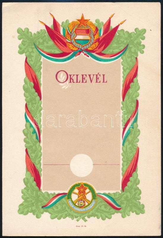 cca 1960 Kitöltetlen karhatalmista szolgálati oklevél https://www.darabanth.com/de/323-Fernauktion/323.0/Andere-Sammelgebiete/Drucksachen~500028/cca-1960-Kitoltetlen-karhatalmista-szolgalati-oklevel~II1790763