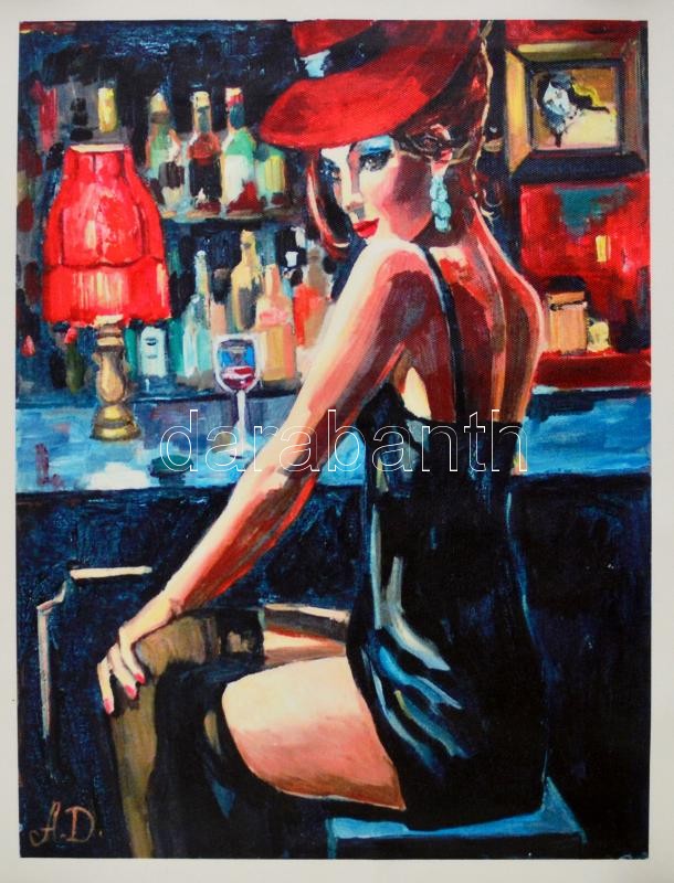 Beschreibung: Kalapos nő a bárpultnál, színes nyomat, 45×35 cm