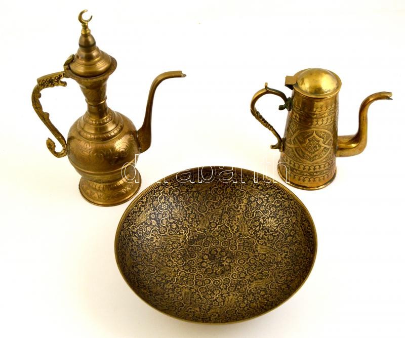 Beschreibung: Nagyméretű díszes réz kiöntők és tál. 30 cm