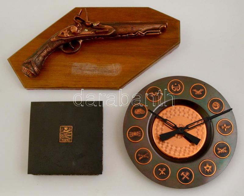 Beschreibung: Vegyes bolhatétel: dekoratív falióra, pisztolyreplika, MHSZ ajándékdoboz