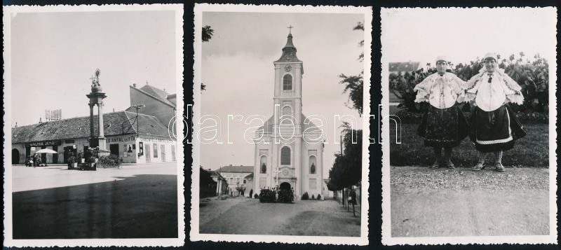 Beschreibung: 1937 Mohács, Életképek (Szentháromság szobor, belvárosi plébánia templom, sokác asszonyok), 12×9 cm