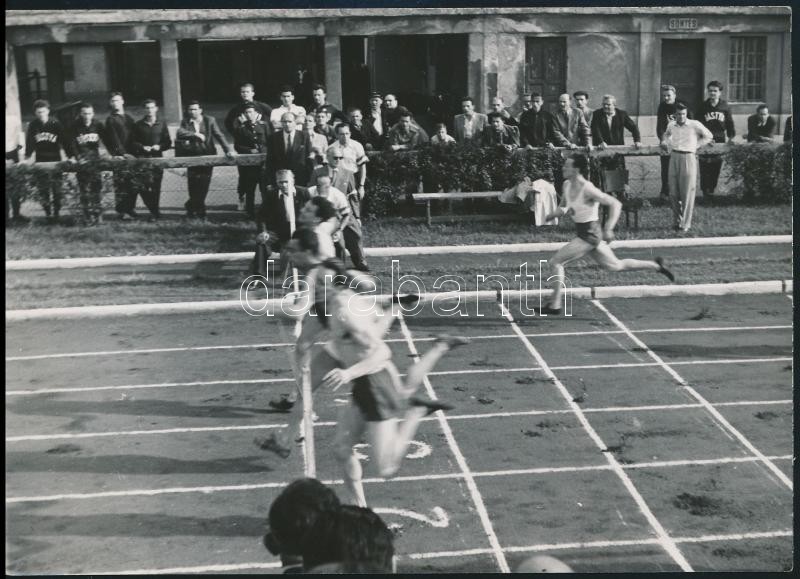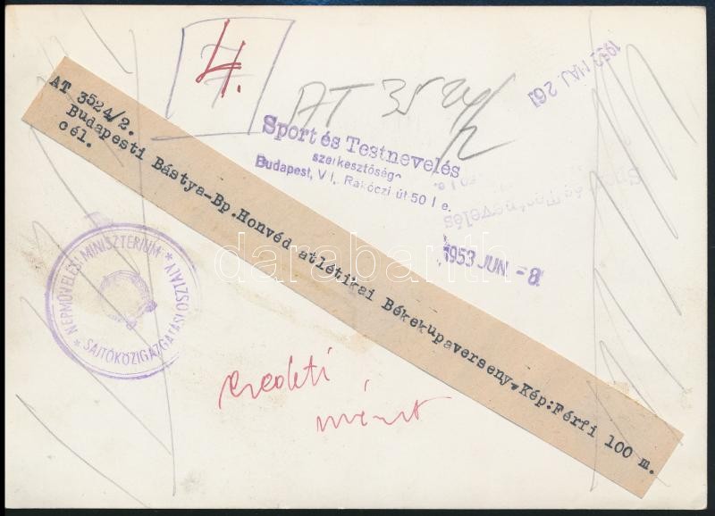 1953 A férfi 100 m futás a budapesti Bástya - Bp. Honvéd atlétikai Békekupaversenyen, sajtófotó, a Sport és Testnevelés felvétele, hátulján pecséttel jelzett, feliratozva, 13×18 cm