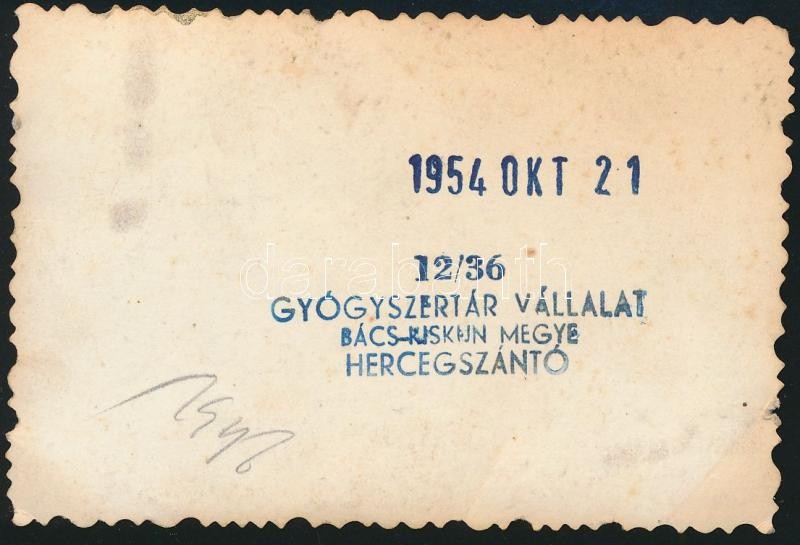 1954 Hercegszántó, gyógyszertár, fotó, hátulján pecséttel jelzett, 6×9... https://www.darabanth.com/de/323-Fernauktion/323.0/Andere-Sammelgebiete/Foto~500019/1954-Hercegszanto-gyogyszertar-foto-hatuljan-pecsettel-jelzett-6C3979-cm~II1793744