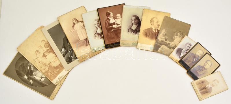 cca 1880 Kis keményhátú fotó tétel: portrék, csoportképek, különféle műtermekből (Mai és Társa, Divald, Koller, Szenes, stb.), összesen 13 db, különböző méretben