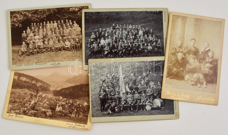 cca 1890-1900 5 db régi keményhátú fotó, Josef Vinzenz (Feldkirch), Alfred Wolf (Konstanz), 3 db csoportkép, az egyiken rezesbandával, Feldkirch (Ausztria (Voralberg)) város fotója, családportré kutyával, 12x16 cm és 16x10 cm.