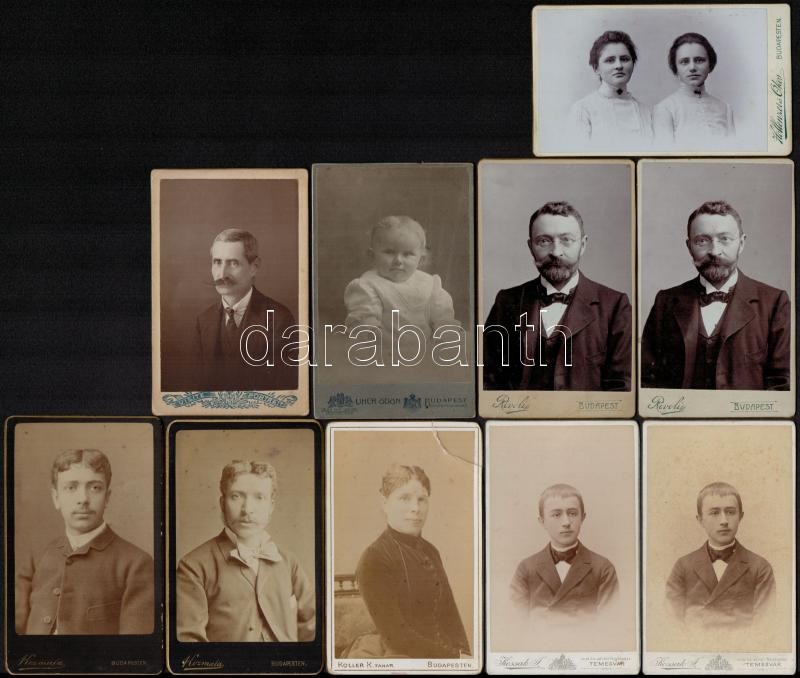 cca 1900 Portrék, 10 db keményhátú fotó, köztük egyezőek is, különböző műtermekből (Kossak, Temesvár; Kozmata, Uher, Rivoli, Hollenzer és Okos, Budapest), 11×6,5 cm