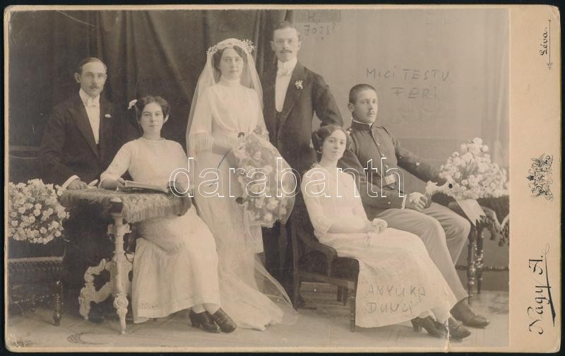cca 1910 Fiatal házasok barátaik körében, keményhátú fotó egy lévai mű... https://www.darabanth.com/de/323-Fernauktion/323.0/Andere-Sammelgebiete/Foto~500019/cca-1910-Fiatal-hazasok-barataik-koreben-kemenyhatu-foto-egy-levai-muterembol-serule~II1795224