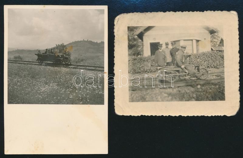 Beschreibung: cca 1930-1940 Sínautó és vasúti hajtány, 2 db fotó, 6×7 és 8×6 cm