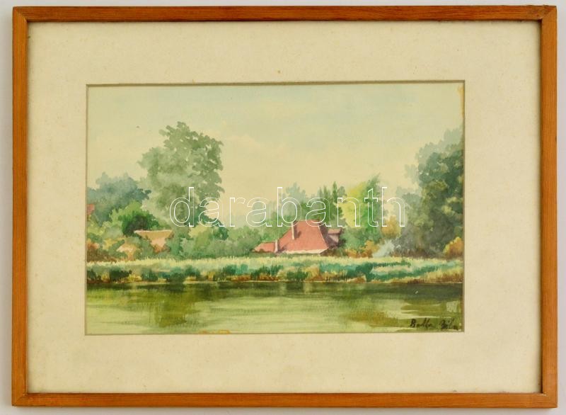 Beschreibung: Balla jelzéssel: Tóparton, akvarell, papír, paszpartuban, üvegezett fa keretben, 20×29 cm