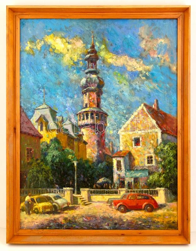 Beschreibung: Csongor József (1913-1981) : Sopron tűztorony. Olaj, falemez, jelzett, keretben, 74×55 cm
