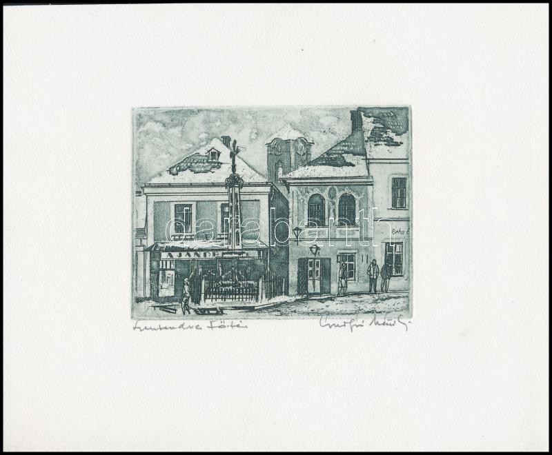 Beschreibung: Csurgói Máté Lajos (1931-2001): Szentendre főtér. Rézkarc, papír, jelzett, 8,5x11 cm.