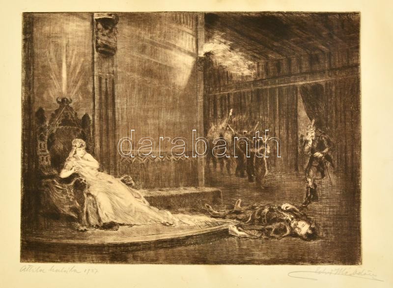 Beschreibung: Edvi Illés Ödön (1877-1945): Attila halála, rézkarc, papír, jelzett, a szélei foltosak, szakadozottak, 23x31 cm.