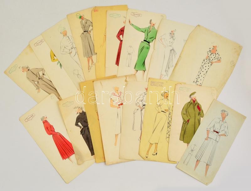 Beschreibung: Létray Klára (?-?), Bereznay-Szemere Györgyi (?-?): 17 db ruhaterv, akvarell, papír, egy részük hátulján pecséttel jelzett, különböző méretben