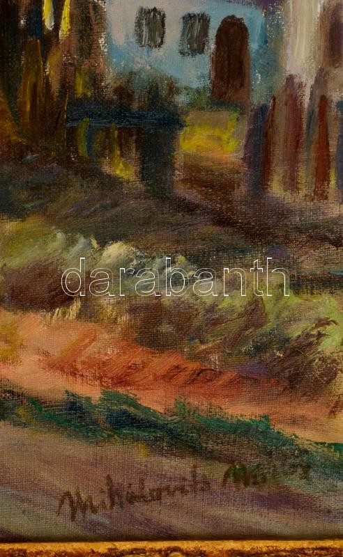 Beschreibung: Mihalovits jelzéssel: Sorompók a magasban. Olaj, vászon, sérült keretben, 50×60 cm