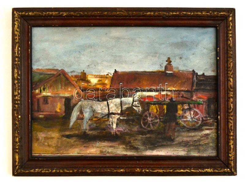 Beschreibung: Olvashatatlan jelzéssel: Vásárra készülő gazda. Olaj, karton, keretben, 23×33 cm