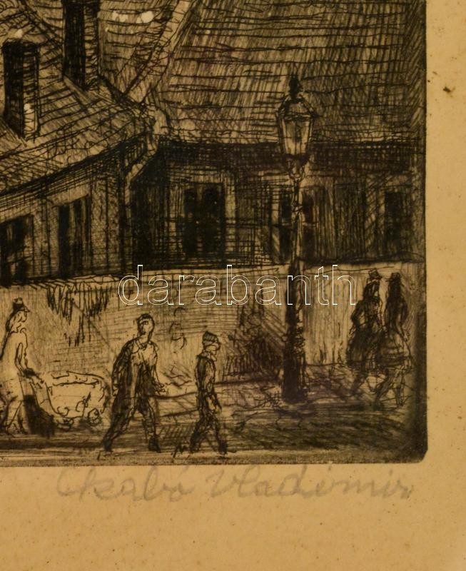 Beschreibung: Szabó Vladimir (1905-1991): Naphegy utca, rézkarc, papír, jelzett, üvegezett keretben, 29,5×39 cm