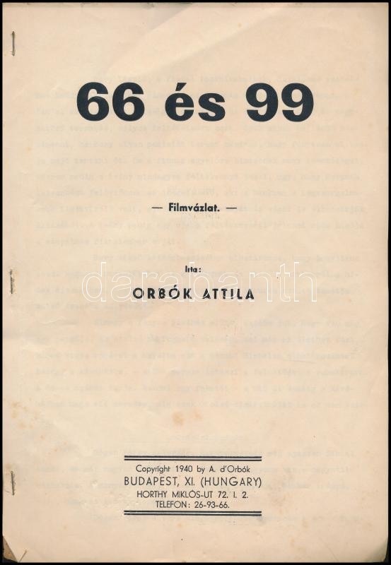 1940 Orbók Attila: 66 és 99. Filmvázlat. Gépirat néhány javítással, tűzött papírkötésben.