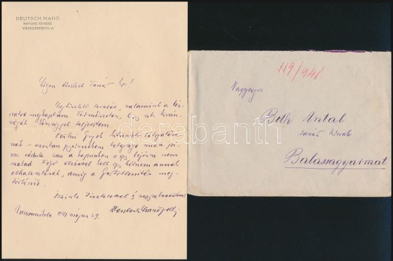 1941 Vámosmikola, Deutsch Manó(1898-1944) kerületi főrabbi személyes h... https://www.darabanth.com/de/323-Fernauktion/323.0/Andere-Sammelgebiete/Judaica~500023/1941-Vamosmikola-Deutsch-Mano1898-1944-keruleti-forabbi-szemelyes-hangvetelu-levele~II1789898
