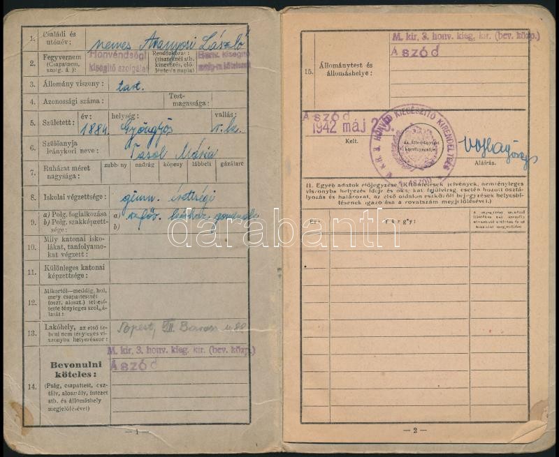 Beschreibung: 1942 Aszód, Igazolványi lap nemes Aranyosi László részére, "Zs" felülnyomással