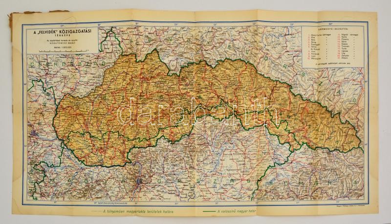 cca 1940 A Felvidék Közigazgatási Térképe, 1:900.000. Az alaptérképet tervezte és rajzolta Kogutowitz Manó, Bp., é.n , Magyar Földrajzi Intézet Rt., az elülső borítón hiányzik, a hátsó térkép kissé szakadozott,de maga a térkép jó állapotban, 74x38 cm.