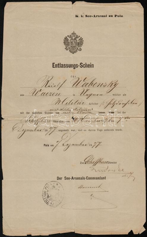 1877 Pola, K. k. See-Arsenal zu Pola, Katonai elbocsátó levél https://www.darabanth.com/de/323-Fernauktion/323.0/Andere-Sammelgebiete/Militaria~500025/1877-Pola-K-k-See-Arsenal-zu-Pola-Katonai-elbocsato-level~II1794139