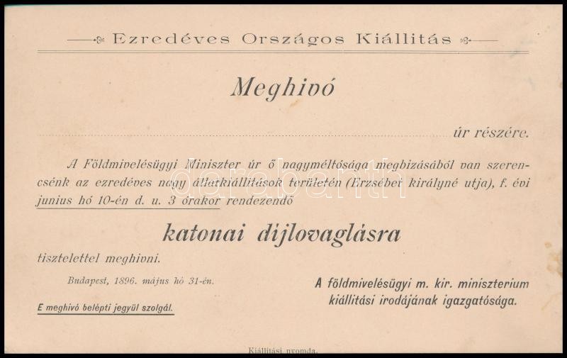 Beschreibung: 1896 Bp., Kitöltetlen meghívó a millenniumi kiállítás katonai díjlovaglására